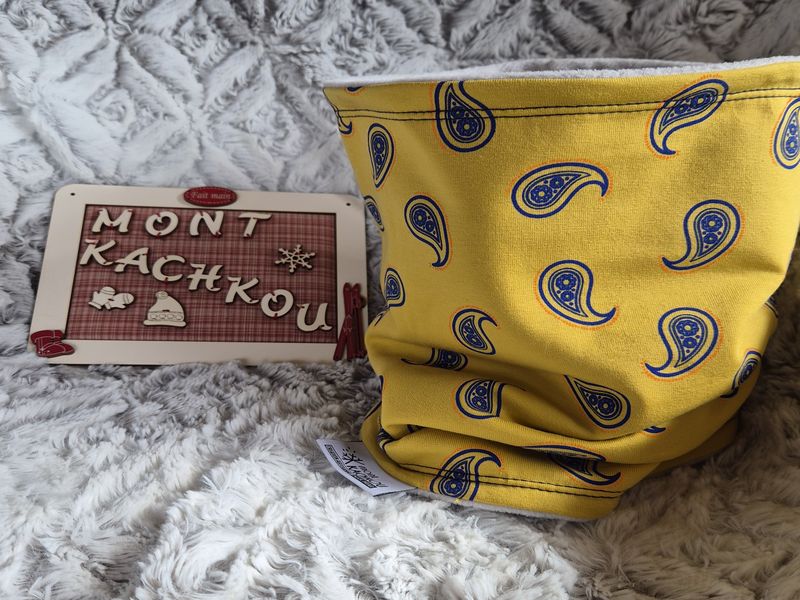 Cache-cou 100% jersey de coton oeko tex, polaire gris clair 100% polyester. Coloris moutarde et motifs marines.